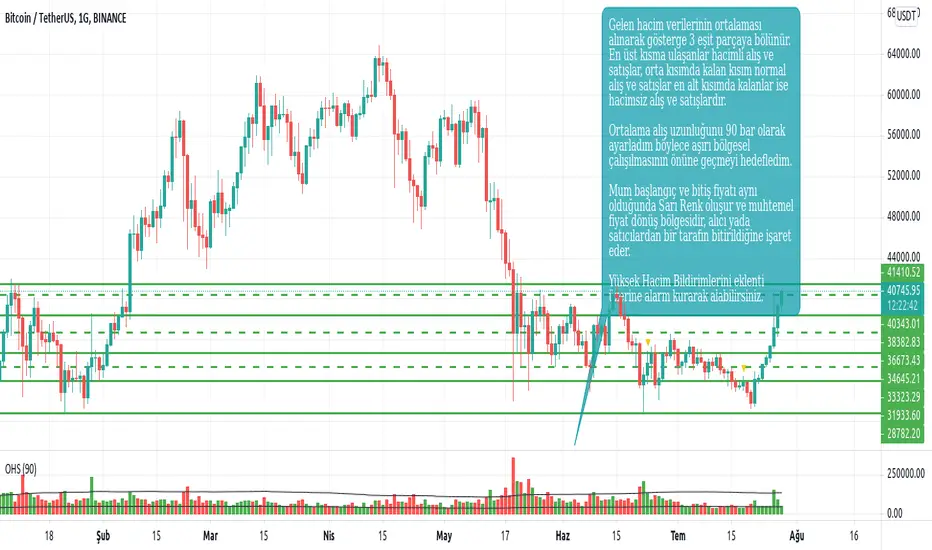 The indicator is divided into 3 equal parts by taking the average of the incoming volume data. Those that reach the top are volume buying and selling, the middle section is normal buying and selling, and the bottom section is non-volume buying and selling.