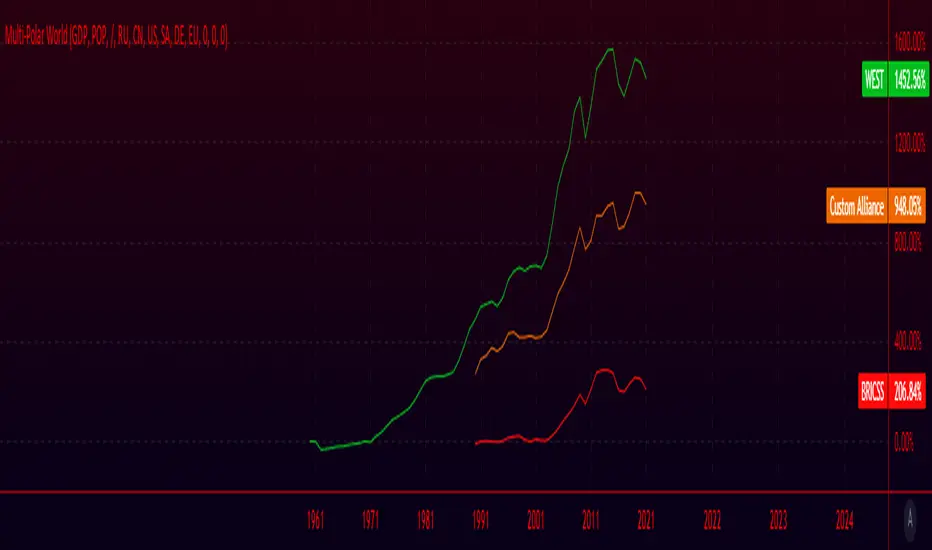 GDP, GDP per Capita, External Debt, Government Debt, Exports, Imports, Gold Reserves, Employed Persons, Military Expenditure, Population, Bank Lending Rate, Balance of Trade, Central Bank Balance Sheet, M2 Money Supply, and CPI. Includes option to provide the total for each pole, or view individually for more detailed comparison. Meant to be used when analyzing the macro-economic conditions/trends in conjunction with other "Big Picture" type indicators when adjusting your macro framework.