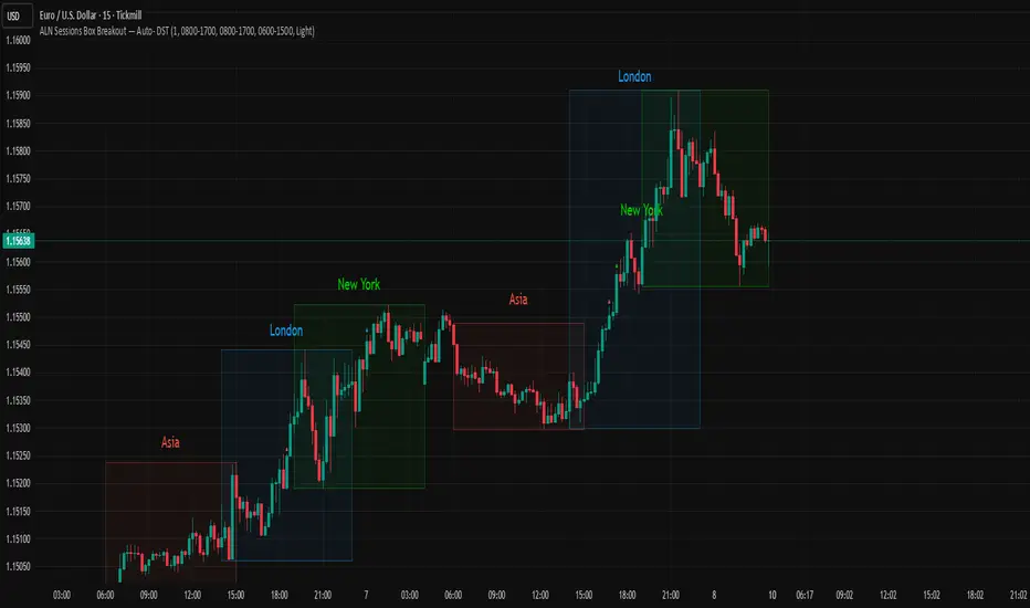Candle-linked boxes: Top/bottom track session High/Low; right edge finalizes on the session end bar—clean breakout zones.