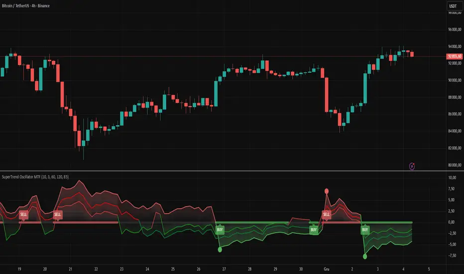 The classic SuperTrend value is subtracted from price and normalized so that trend direction can be directly compared across different timeframes without switching charts.