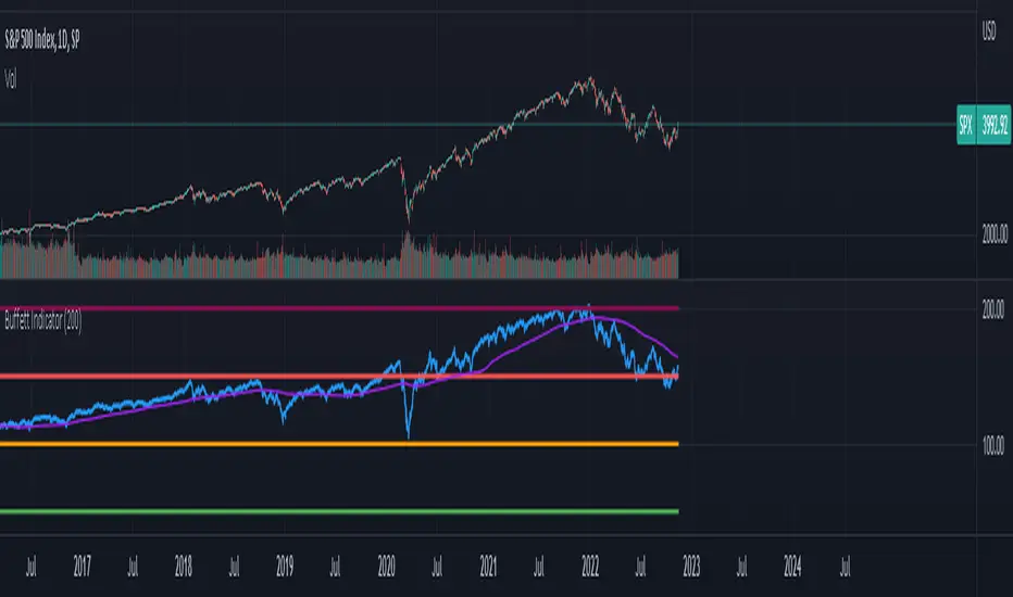A simplistic Buffett Indicator that shows the ratio of total US stock market valuation to GDP. Lines are plotted to represent 50%, 100%, 150%, and 200% of GDP. All plotted lines can be hidden to suit your own needs.