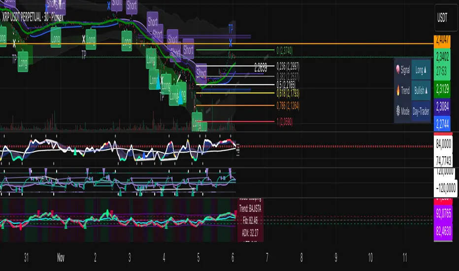 Adaptive momentum + trend timing built on a WaveTrend core, normalized per timeframe for a consistent look across scalping, intraday and swing. It blends WT, RSI, MFI and Momentum into one read, adds dynamic volatility bands, a Fib-61.8% bias line, and smart signals with optional ADX + HTF confirmation.