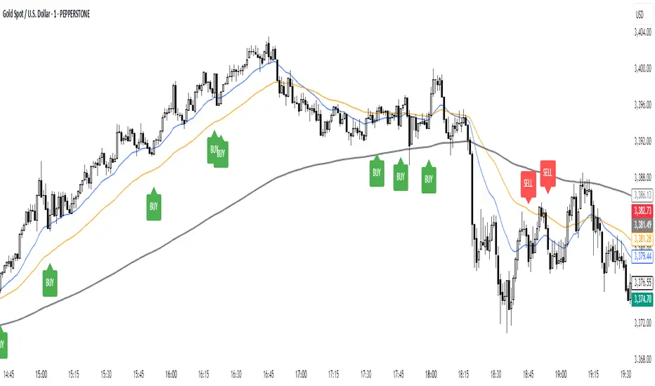 The system is based on three Exponential Moving Averages (EMAs): 21, 50, and 200.