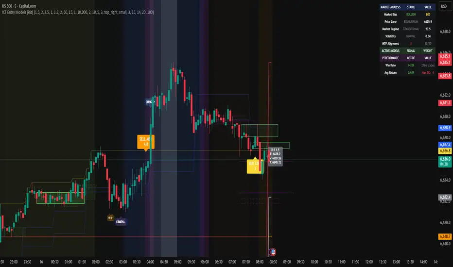 The ICT Entry Models Indicator is a complete framework built to help traders visualize and apply multiple Institutional concepts on a single chart. Instead of relying on one entry technique, this tool combines 14+ ICT entry models and evaluates them under a unified structure. Each model is detected independently but filtered through a multi-factor confluence engine that considers liquidity, higher-timeframe structure, premium/discount zones, and session context. This ensures only high-probability setups are highlighted.