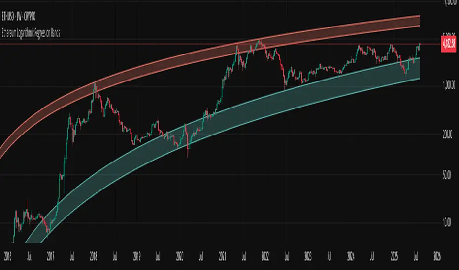 This indicator displays logarithmic regression bands for Ethereum. Logarithmic regression is a statistical method used to model data where growth slows down over time. I initially created these bands in 2021 using a spreadsheet, and later coded them in TradingView in 2022. Over time, the bands proved effective at capturing bull market peaks and bear market lows. In 2025, I decided to share this indicator because I believe these logarithmic regression bands offer the best fit for the Ethereum chart.