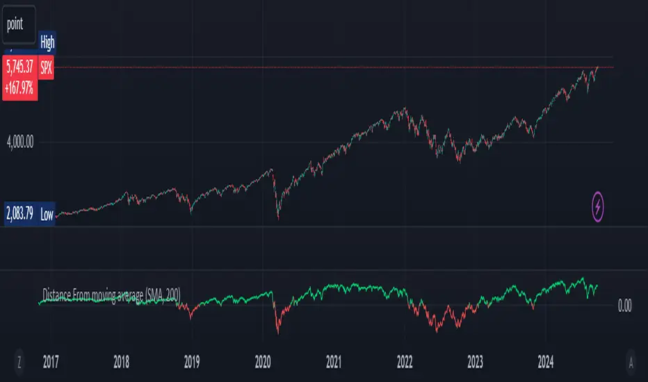 The indicator calculates the distance between the current price and the chosen moving average, providing insight into market momentum. A positive value indicates that the price is above the moving average, while a negative value shows it is below.
