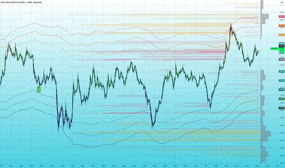 The indicator combines a Dollar-Cost Averaging (DCA) strategy after downtrends with liquidation level detection, providing comprehensive market analysis.
