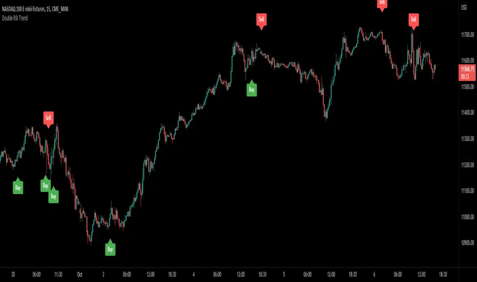 This is my Double RSI Trend Indicator. It issues Buy and Sell signals based on the Supertrend and a double RSI . The RSIs cross near or at the same time as the Supertrend fires. It has the ability to change if you want signals based on the RSI cross on the same candle, one candle before, and two candles before. I find this one extremely good at catching reversals as long as you filter out some of the signals based on trend.