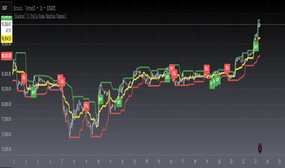 OVERVIEWThe [blackcat] L1 Stella Osoba Donchian Channels indicator is designed to help traders identify key support and resistance levels using Donchian Channels. Based on the principles outlined by Richard Donchian and presented by Stella Osoba, this indicator plots upper, lower, and optional middle channels to provide a clear view of market volatility and potential breakout points. It also generates buy and sell signals when specific conditions are met, aiding in timely decision-making 📈💹.