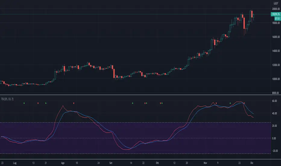The script highlights when TSI line crosses the signal line with a colored triangle, that is