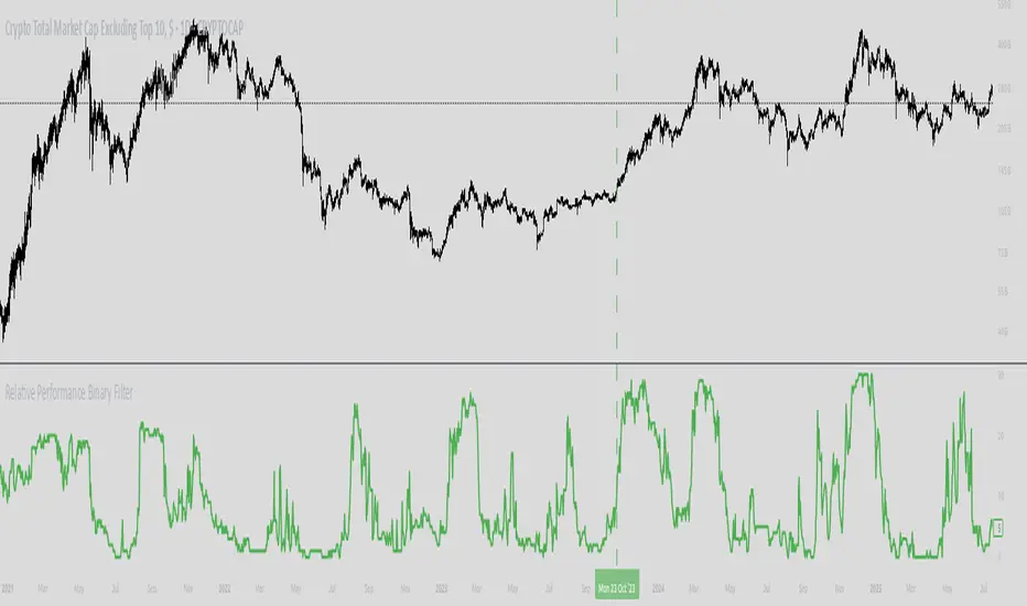 This indicator monitors the relative performance of 30 selected crypto assets and generates a binary signal for each: 1 if the asset’s price has increased above a user-defined threshold over a specified lookback period, 0 otherwise. The script produces a JSON-formatted output suitable for webhooks, allowing you to send the signals to external applications like Google Sheets.