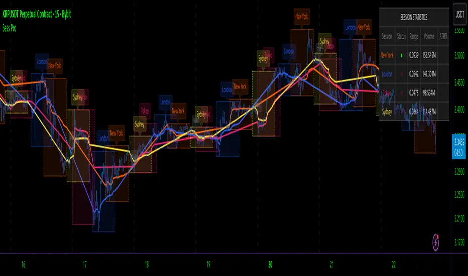 The **Advanced Sessions Pro** indicator is a comprehensive tool designed for traders who operate in global markets, particularly forex, indices, and cryptocurrencies, where multiple trading sessions overlap and influence price action. This indicator visualizes up to four major trading sessions (New York, London, Tokyo, and Sydney) on your chart, providing not just basic session highlighting but a suite of advanced analytical features to help identify intra-session trends, key levels, volume-weighted metrics, and statistical insights.