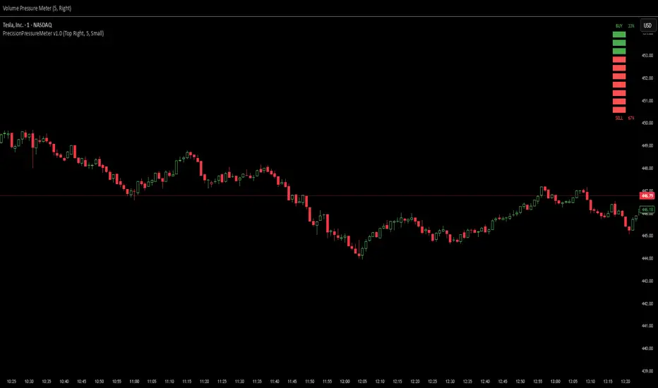 The meter calculates buy/sell pressure based on where price closes within each bar's range. A close near the high = buyers won that bar. A close near the low = sellers won. The meter displays this as a simple 10-block vertical gauge.