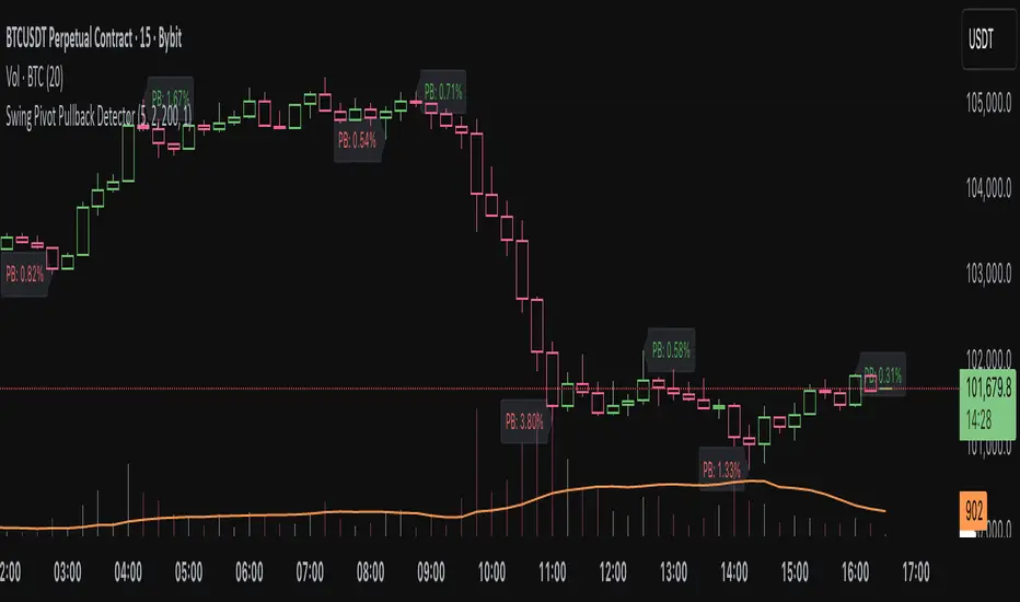 - When a valid pullback is found, a small label appears on the chart showing the percentage size of that retracement compared to the previous pivot leg.
