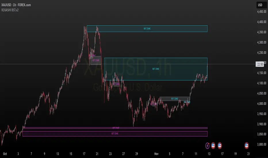 The REKASHI BST.v2 indicator automatically detects bullish and bearish momentum zones based on advanced Heikin Ashi candle structure and price strength logic.