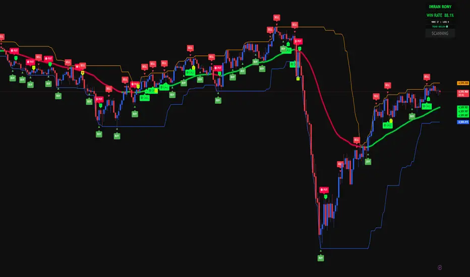 The indicator also features a real-time performance dashboard displaying Win Rate, total Wins & Losses, current Trend direction, and active signal status, allowing traders to monitor performance directly on the chart.