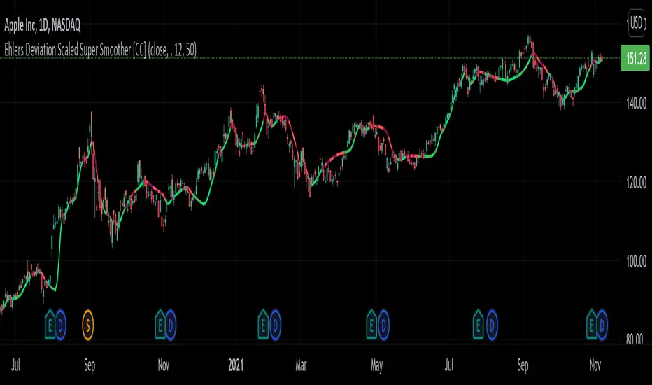 The Deviation Scaled Super Smoother was created by John Ehlers and this is an excellent moving average that changes direction very quickly and can keep up with the current underlying trend. This indicator works by applying a Hann Windowed Moving Average to the stock's momentum and scaling that by the Root Mean Square and then using that value in the input for a Super Smoother. I have included strong buy and sell signals in addition to normal ones so lighter colors are normal signals and darker colors are strong ones. Buy when the line turns green and sell when it turns red.