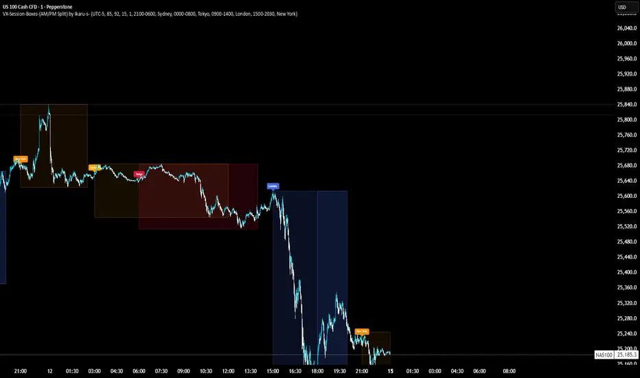 VX-Session-Boxes-(AM/PM Split) is a session-based visualization tool for TradingView that highlights major market sessions directly on the chart using dotted range boxes and an optional AM/PM split.