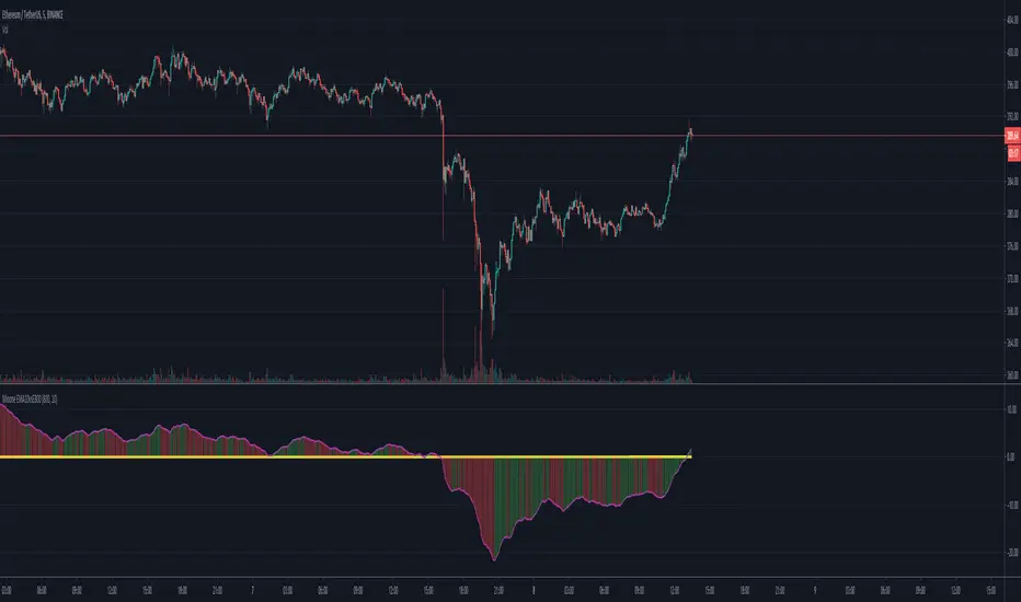 The first EMA XX value (800) represents the basis of this graph. In addition, the current value of EMA YY (10) is subtracted and thus shows the trend of the coin.