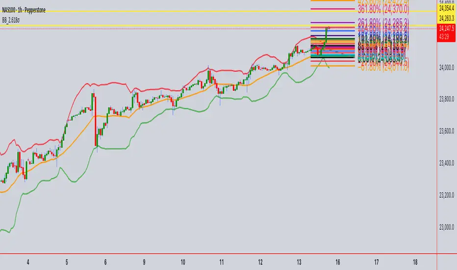 This indicator blends volatility-based bands with Fibonacci momentum analysis and classical candle rejection patterns. The combination of Bollinger Bands (21, 2.618σ) and RSI Fibonacci levels helps traders detect high-probability rejection zones, reversal opportunities, and overextended conditions with improved accuracy over traditional default settings.