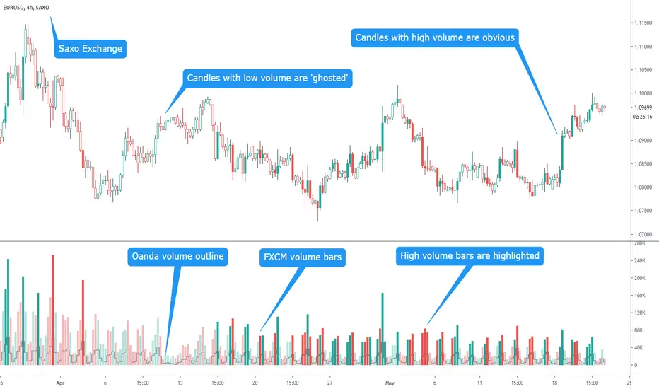 You can choose a primary exchange for the main changes and a secondary exchange for a line chart in front. These exchanges are INDEPENDANT of the exchange you are looking at so if your broker does not show volume, you can use the volume supplied by another broker who does. For example, you might be looking at a chart from Saxo exchange (who I don't think supplies volume) but see volume from FXCM as the primary with pattern confirmation from Oanda as the secondary.