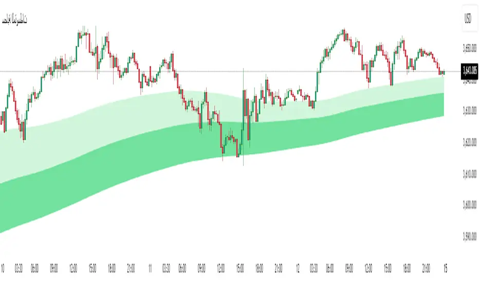 المؤشر يرسم 3 متوسطات متحركة (يمكن اختيار نوعها: SMA/EMA/WMA/VWMA/HMA/RMA) ويُنشئ سحابتين بين هذه المتوسطات لإظهار الاتجاه والزخم بصريًا، مع منطق تلوين ذكي يميز حالات الترتيب “الطبيعي” والشواذ بين المتوسطات.