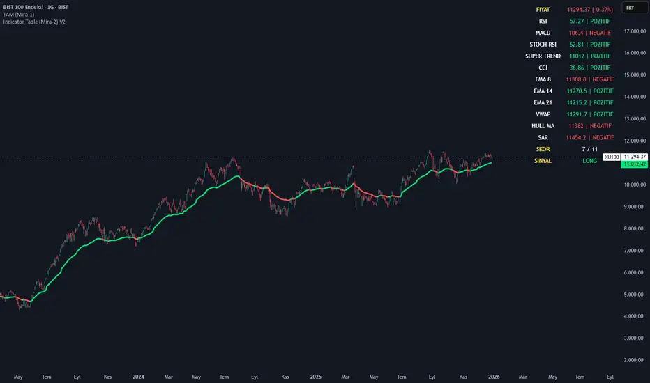 Displays indicator values based on the current chart timeframe in a table. It issues a Long signal if the score is >7 and a Short signal if the score is <4.