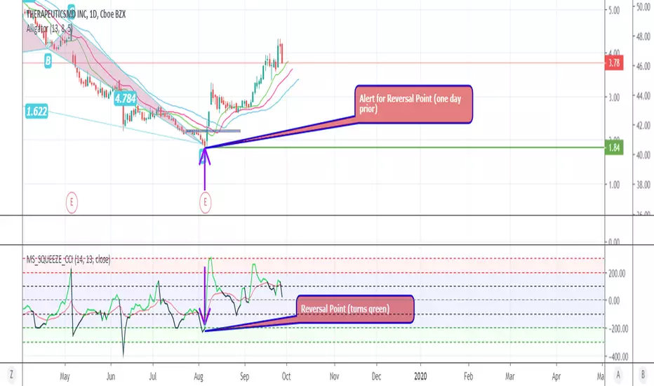 I have used this indicator to find many lucrative opportunities. This indicator takes the moving average of CCI in custom, volatility-specific conditions. CCI measures "overbought" in the red-shaded region and "Oversold" in the green-shaded region. The shaded regions do not constitute a buy/sell signal alone, the MS CCI Squeeze is best used when market conditions agree and is best used when the user has fundamental reasoning for "reversal-like" situations to align. The MS CCI Squeeze will soon have a synergistic partner called "MS RSI Squeeze" indicator that will look similar to help better measure volatility and strength trend.
