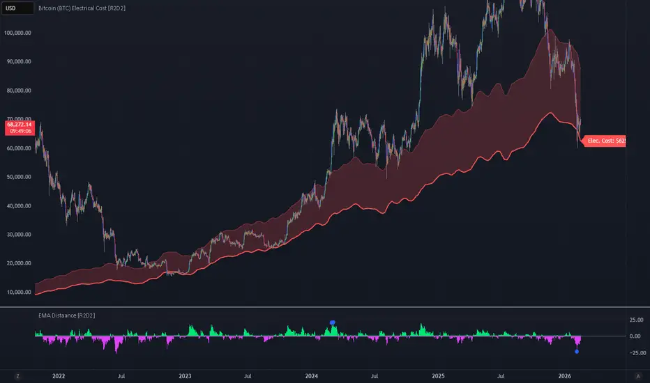 This indicator visualizes the Miner Profitability Ribbon, helping you identify generational bottoms where Bitcoin's price touches its raw electrical production cost.