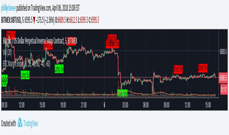 I primarily use this on BitMEX with BTC, but you can use it with other exchanges and coins. You may have to adjust the inputs depending on the coin and the timeframe you use. Do not blindly follow this to make purchases. This is just an alert system to notify you of possible trades.