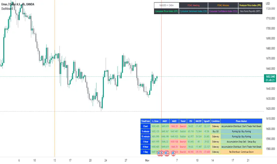 This is a multi timeframe (MTF) MACDV Dashboard and comes with additional features to show you whether there is currently a bullish or bearish cross for the EMA period you have selected in the settings menu, and identify the state of the market phase.