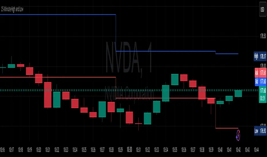 This indicator automatically plots the previous 15-minute candle’s High and Low on any intraday chart. These two levels are some of the most important reference points for scalpers and intraday momentum traders, often acting as breakout zones, reversal spots, liquidity targets, and micro-range boundaries.