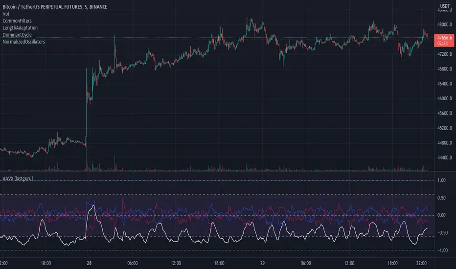 The oscillator also has the option to configure the internal smoothing function with Window setting. By default, RMA is used (like in ADX calculation). Fast Default option is using half the length for smoothing. Triangle, Hamming and Hann Window algorithms are some better smoothers suggested by John F. Ehlers.