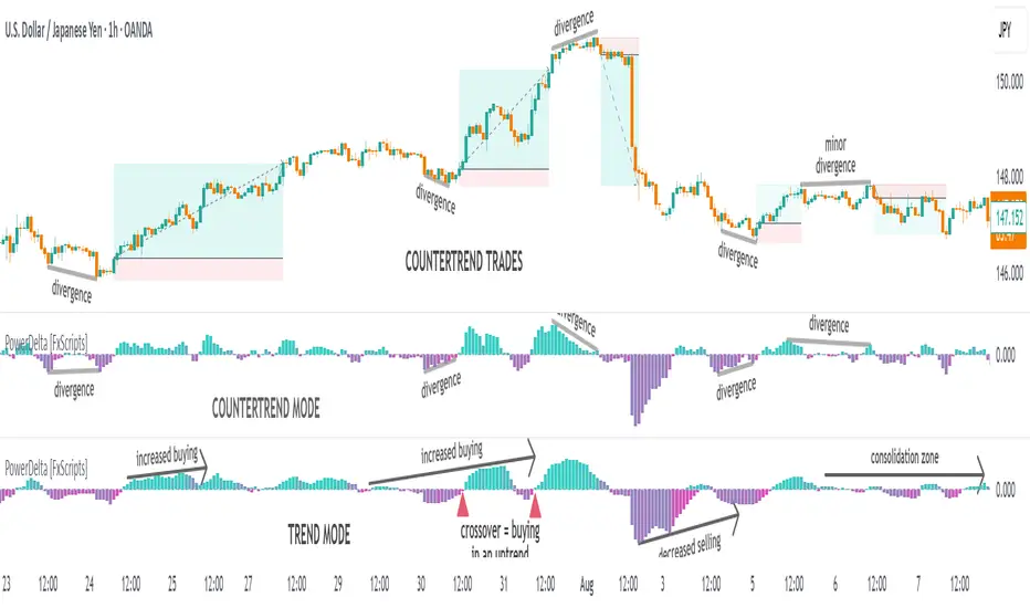 - In Countertrend Mode, the primary use of the PowerDelta Oscillator is to locate divergences between price and the oscillator (as visualised on the chart above) which helps traders pinpoint potential reversals
