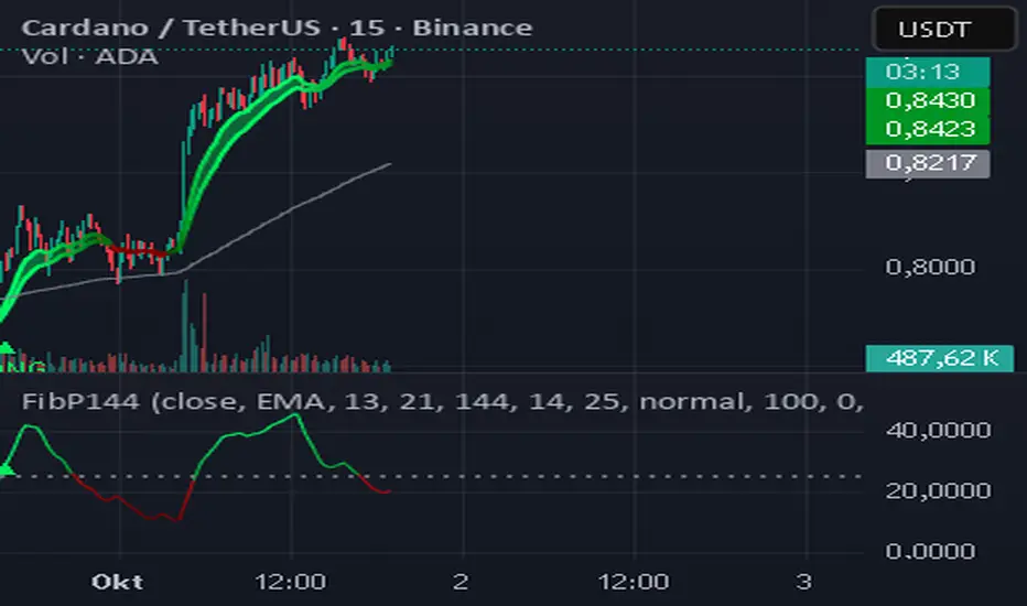 FibPulse144 combines a fast moving-average crossover with a 144-period trend regime and an ADX strength gate. Signals are confirmed on closed bars only and drawn as labels on the price chart, while an ADX line in a separate pane provides context. Color gradients are derived from normalized ADX, so visual intensity reflects trend strength without changing the underlying logic. The approach reduces false flips during weak conditions and keeps entries aligned with the dominant trend.