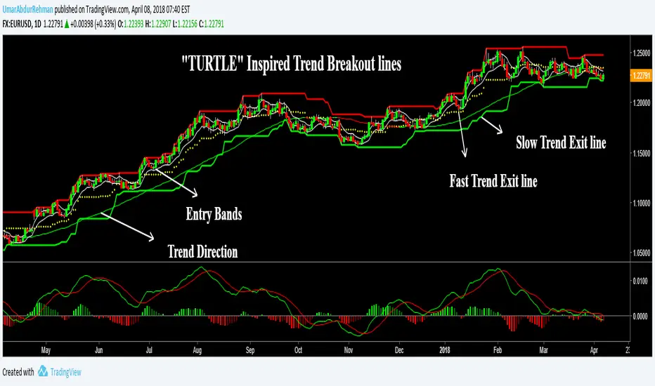 Upper and lower lines are certain bars look back period, user can modify numbers according to trading style. Yellow dots represent trailing stops and the middle line shows trend direction.