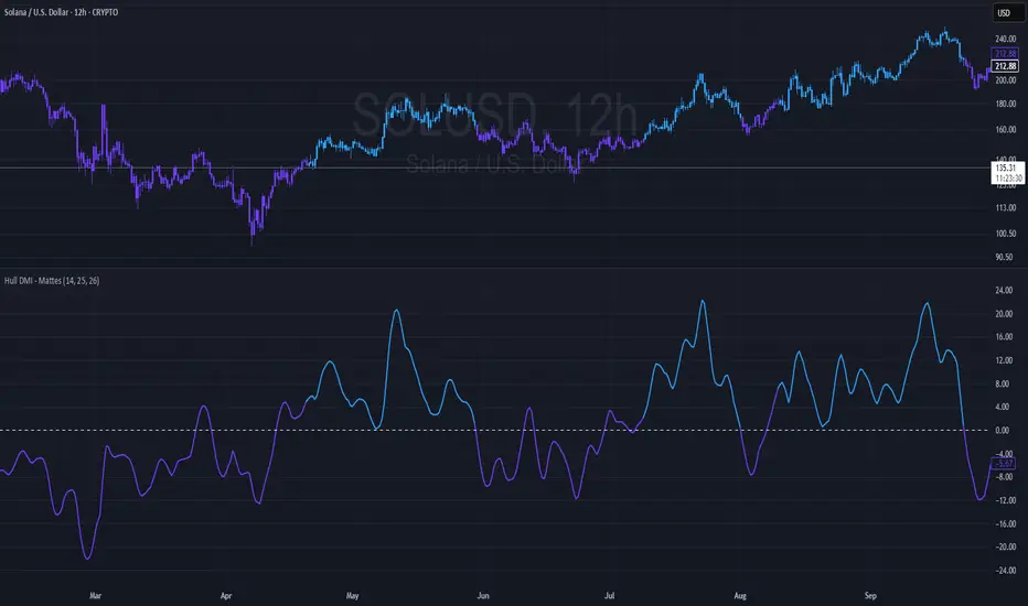- Hull-Smoothed Inputs: Applies HMA to highs and lows before computing directional changes, reducing noise and lag compared to standard DMI.