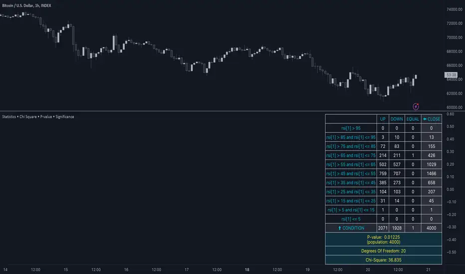 • This test only works for categorical data (data in categories), such as Gender {Men, Women} or color {Red, Yellow, Green, Blue} etc., but not numerical data such as height or weight. One might argue that such tests shouldn't use rsi, close, ... values.