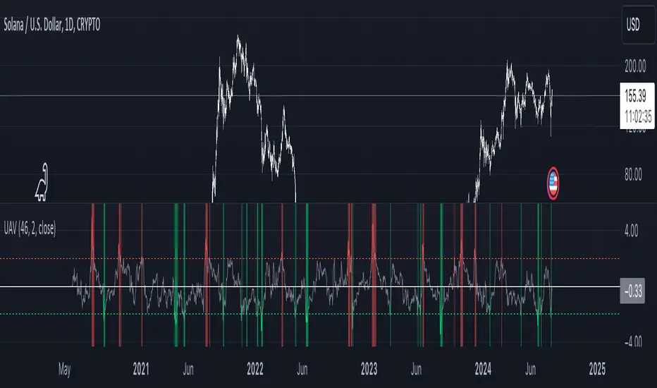 The UAV indicator utilizes a z-score analysis of the Relative Strength Index (RSI) to offer insights into current market conditions.