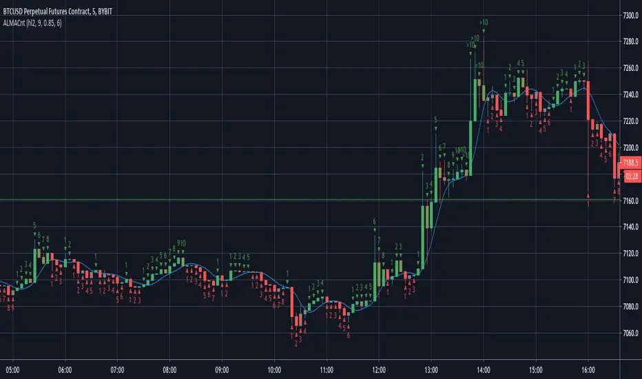 It counts how many candles are below or above the Arnaud Legoux Moving Average (ALMA).