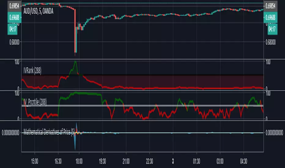 This indicator is meant to show the Velocity (1st order derivative), Acceleration (2nd order derivative), Jerk (3rd order derivative), Snap (4th order derivative), Crackle (5th order derivative), & Pop (6th order derivative) of price. The values at the top of the indicator window are in this order from left to right. I don't particularly know how this would be used in a trading strategy, but if you're ever curious about how quickly price is moving and how much it is accelerating, then you could use this tool.