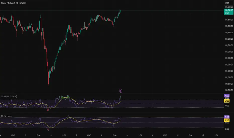 The Chebyshev-Gauss RSI is a variant of the standard Relative Strength Index (RSI) that uses the Chebyshev-Gauss Moving Average (CG-MA) for smoothing gains and losses instead of a traditional Simple or Exponential Moving Average. This results in a more responsive and potentially smoother RSI line.