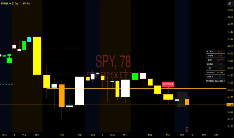 A multi-feature indicator combining volume-based POC detection, 6-level momentum candle coloring, higher timeframe buy/sell signals, and order block identification.