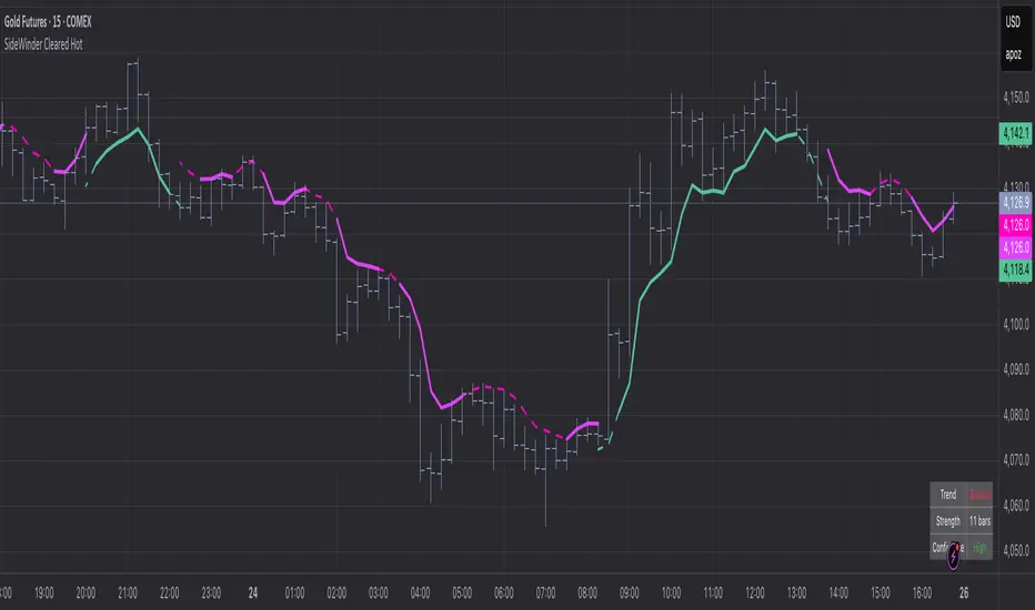 SideWinder Cleared Hot is a custom trend indicator that detects uptrends and downtrends by comparing moving averages of highs and lows against look back extremes, plotting a low moving average line during bullish moves (as dynamic support) and a high moving average line during bearish ones (as resistance). The Core of SideWinder is set to dashed lines for medium confidence trends, however the user has the option to select or deselect "Cleared Hot"... A High confident impulse move. The indicator can be customizable, but the best settings for timeframes below 30 min are set as default. As with any indicator, lowering the timeframe will increase the signaling frequency.