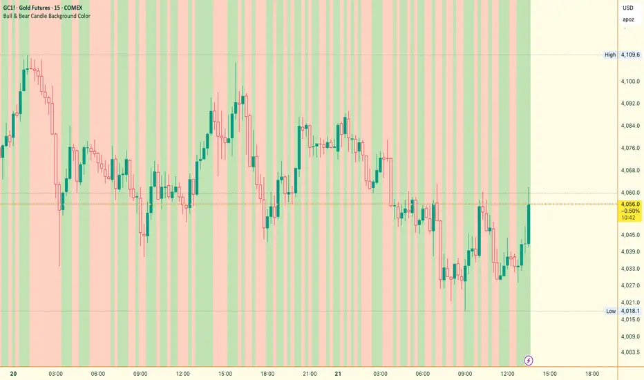 This professional-grade Pine Script v5 indicator provides instant, unfiltered visual feedback on the market's immediate bias by coloring the chart background based on the short-term relationship between Close and Open. It’s designed to streamline decision-making and enhance trade conviction.