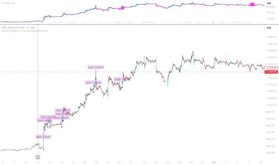The Short-Timeframe Volume Spike Detector is an advanced multi-timeframe (MTF) indicator that automatically detects sudden volume surges and price expansion events on a lower timeframe and displays them on a higher (base) timeframe chart — helping traders identify hidden intraday accumulation or breakout pressure within broader candles.