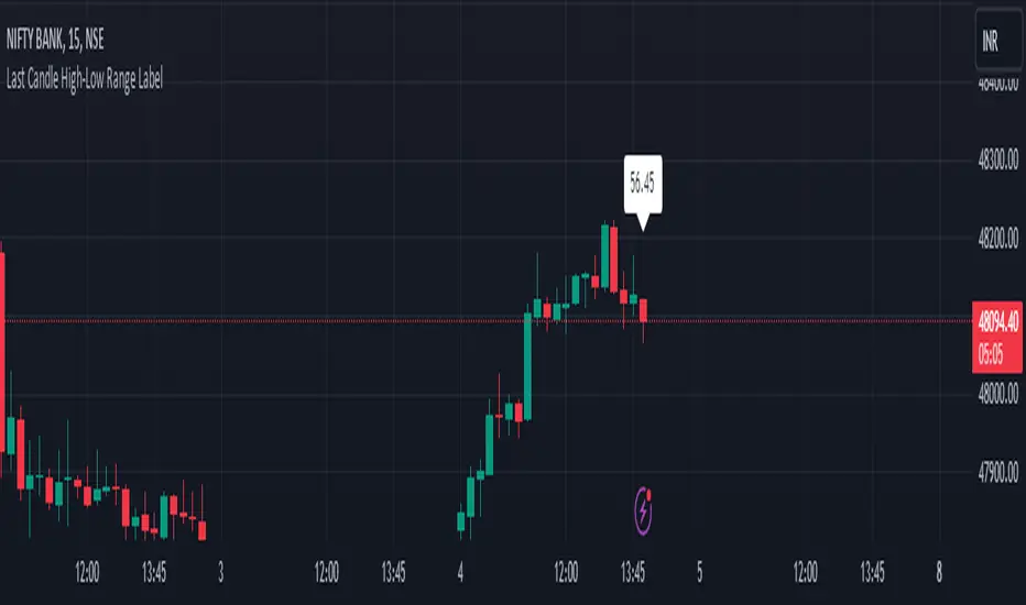 Additionally, the script includes a label that shows the numerical value of the high-low range. This label is positioned between the plotted lines, showing the difference between the high and low prices of the last candlestick.