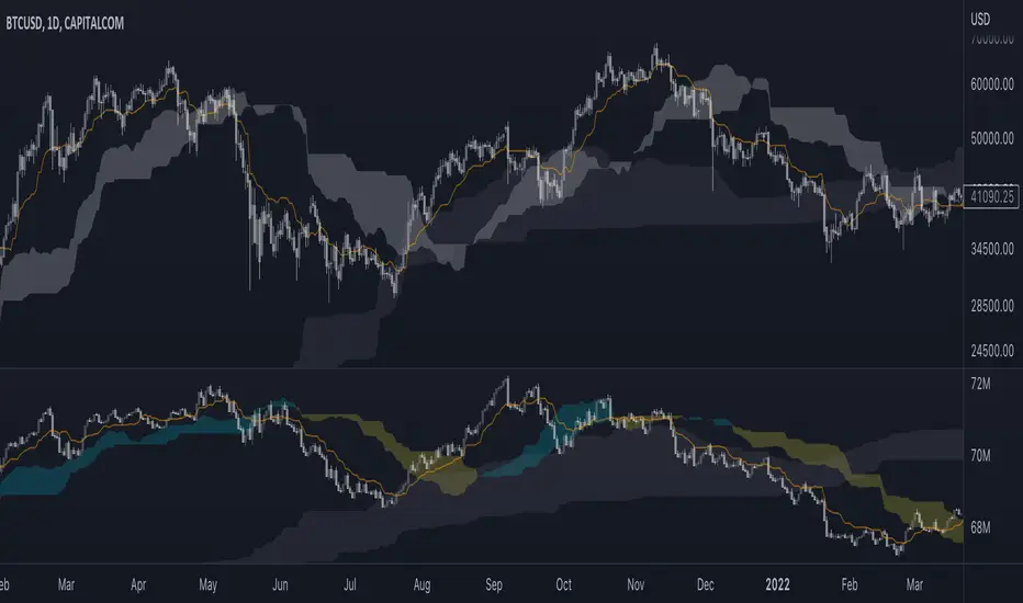 This is a combination of two indicators: the CVD - Cumulative Volume Delta Candles published by TradingView (version v3 2022.07.11) with two Ichimoku clouds: one for the current time frame and another for a bigger time frame.
