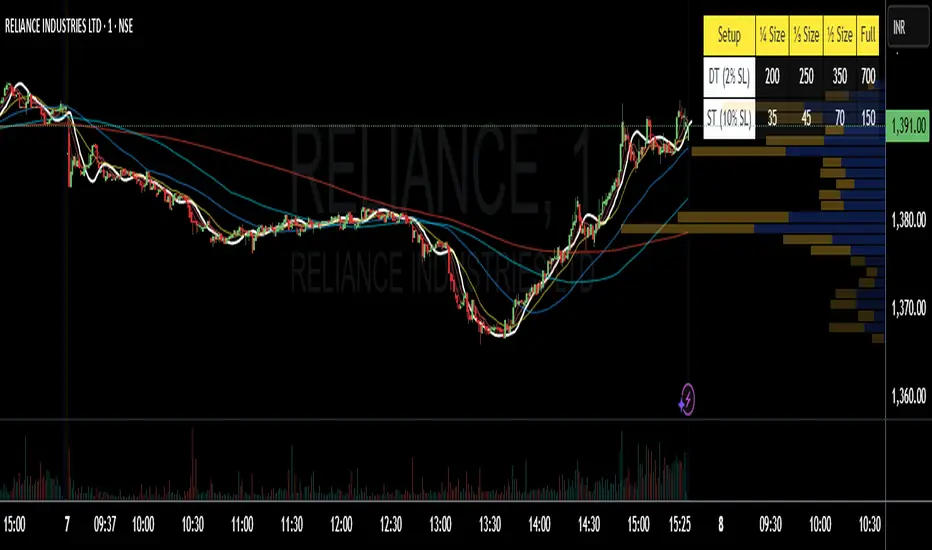 This indicator automatically calculates intraday (DT) and swing trading (ST) position sizes based on your account capital, risk per trade, and stop-loss percentage, using today’s daily open price as the entry price reference.