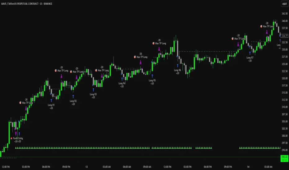 TrendPilot AI v2 is a structured, rules-based day trading strategy that identifies and follows market momentum using a sophisticated blend of technical indicators. Optimized for 15-minute and higher timeframes on high market cap cryptocurrencies (AAVE, SOL, ETH, BCH, BTC) to minimize manipulation risks, it adapts to changing market conditions with dynamic risk management and controlled re-entry logic to maximize trend participation while minimizing noise.